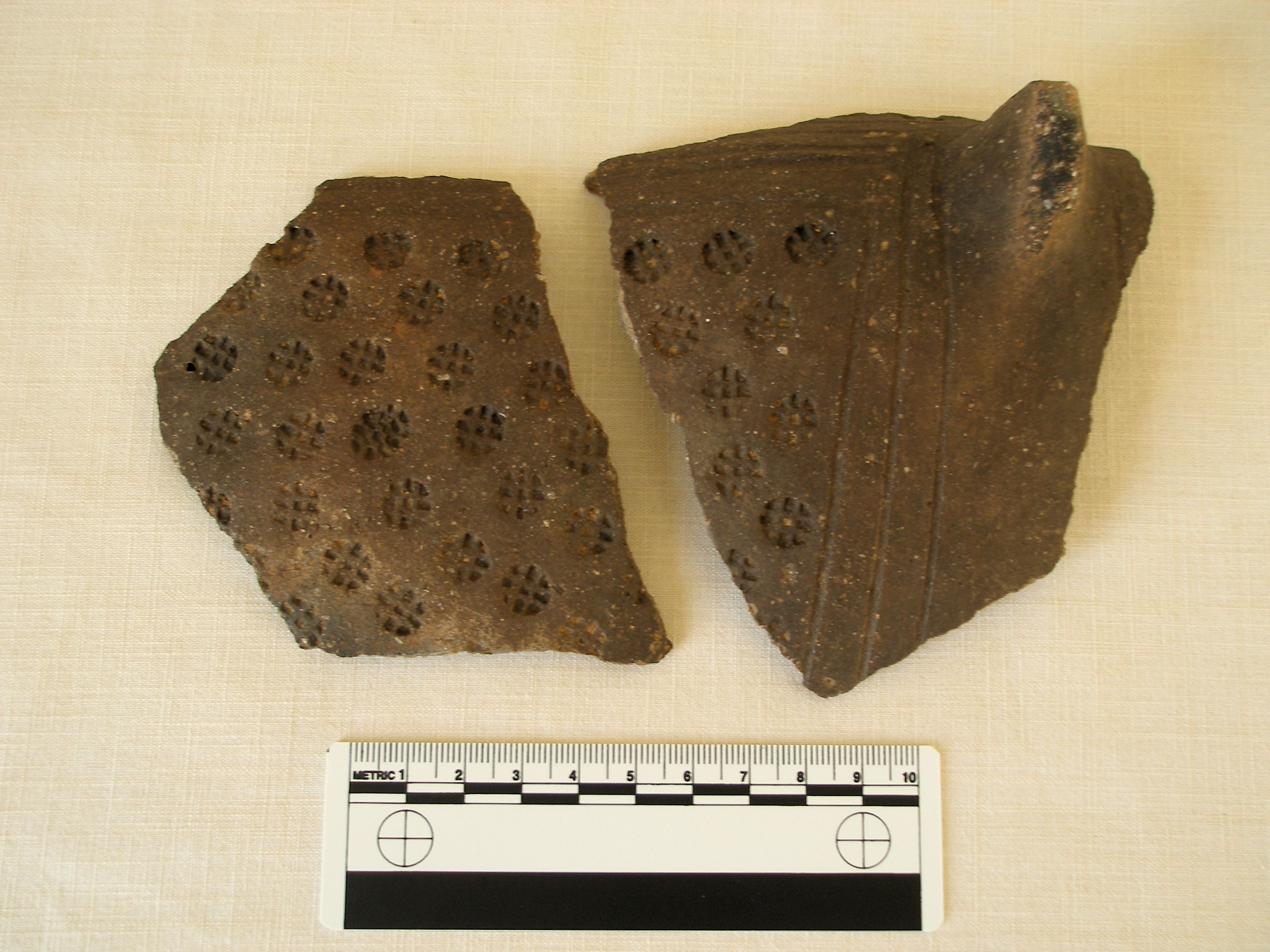 Left: Anglo-Saxon (Anglian) hand-made, decorated pottery dating to the 6th–early 7th century AD and often associated with funerary practices (December 2016).